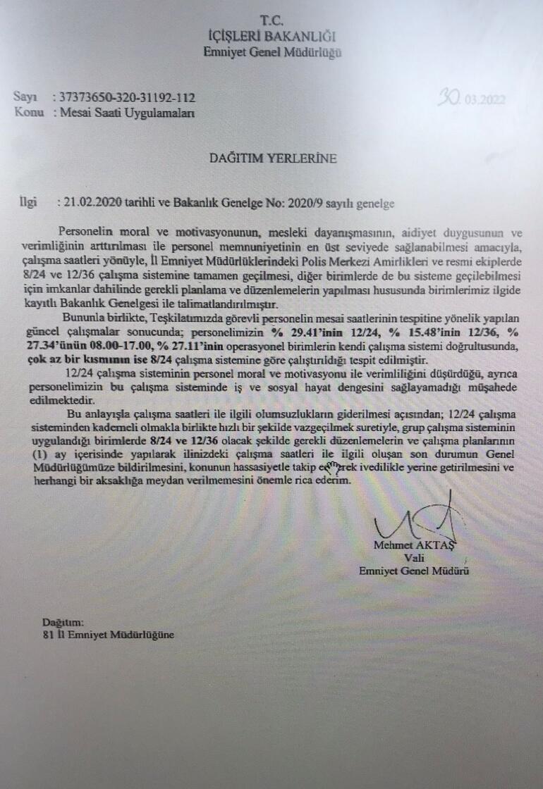 Emniyet Genel Müdürü Mehmet Aktaş imzasını taşıyan yazıda, 12/24 çalışma sisteminde polislerin iş ve sosyal hayat dengesini sağlayamadığı da belirtildi.