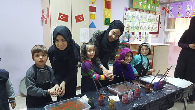 Hatay narlıca’da Hatay Valiliği, İl Milli Eğitim Müdürlüğü ve Kalkın Bakanlığı tarafından desteklenen 4-5 yaş Suriye’li çocukların Türkçe konuşma eğitim projesinde okuyan minik Suriyeli çocuklara ebru çalışmaları yapıldı Geleneksel Sanat Atölyesi ile berabar gerçekleşen çalışma adeta minikler sanatlarını konuşturdular.
