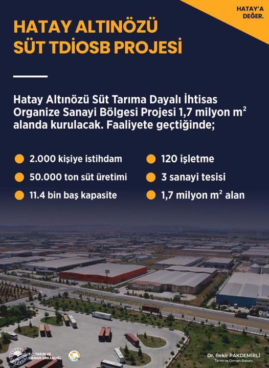 Hatay Altınözü Süt TDİOSB Projesi ile ülkemizin süt üretimine 50.000 ton katkı ve 2.000 kişiye istihdam sağlanacak.